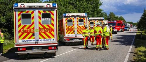 „Die Beteiligten hatten Glück im Unglück, da hätte deutlich mehr passieren können“, so Tabbert. Vor Ort war die Berufsfeuerwehr Neumünster mit dem Rüstzug, vier RTWs, ein Leitender Notarzt sowie der organisatorische Leiter des Rettungsdienstes und drei Polizeistreifenwagen. Für die Dauer des Einsatzes und die Abschlepparbeiten war die B205 in beiden Richtungen voll gesperrt, es bildete sich auf beiden Seiten ein Rückstau.