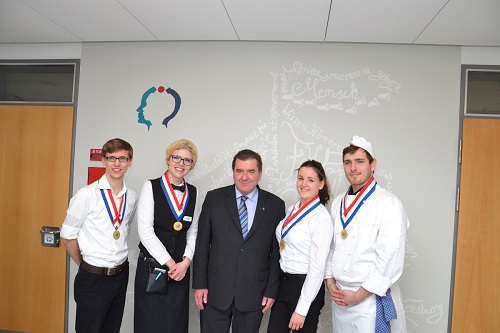 Ihre Leidenschaft zu den gastgewerblichen Berufen mit internationaler Ausrichtung unterstrichen die Gewinner eindrucksvoll. „Mir macht vor allem die Vielfalt an meinem Beruf Spaß – die Fremdsprachen, der Kontakt zu den Gästen und die Qualität beim Service,“ sagte die Hotelfachfrau Pauline Frischen. Der Goldmedaillengewinner bei den Köchen, Bendix Hemsen, freute sich riesig über seine Platzierung: „Meine Lehrer haben mir bei der Vorbereitung auf die Landesjugendmeisterschaften sehr geholfen und auch meine Kollegen im Restaurant Villa Colonial haben mich sehr unterstützt.“ Jaqueline Jürgensen siegte überraschend im Restaurantfach und konnte es nicht fassen: „Ich habe nicht mit meinem Erfolg gerechnet. Ich bin zu den Landesjugendmeisterschaften zu spät gekommen und meine Bluse ist durch den Sturm im Dreck gelandet.“ Vorstellungen zur Karriere hat bereits Arnd Cordes, Goldmedaillengewinner beim Fachmann für Systemgastronomie: „Langfristig möchte ich mein eigenes Systemgastronomie-Restaurant eröffnen. Ich habe schon ein paar Ideen, aber die sind noch nicht spruchreif.“