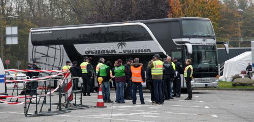 Fotos: Tom Nyfeler – Mehr als 2200 Fans von Hannover 96 wollen das Spiel ihrer Mannschaft beim FC Kopenhagen sehen. Viele Busse und Reisegruppe fahren über Puttgarden. Hier hat die Bundespolizei bis 14.00 Uhr eine große Kontrollstelle eingerichtet. Jeder Bus wird überprüft, zahlreiche Fans mit den Dateien für Gewalttäter abgeglichen. Einigen, besonders auffälligen Fans, wurde die Ausreise verweigert.Sie mussten wieder nach Hannover zurückkehren. Weitere Fans der Kategorie C wurden von der Polizei verwarnt. Bis 14.00 Uhr will die Bundespolizei die Kontrolle noch aufrecht halten.