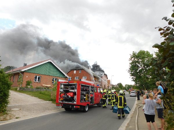 Text und Fotos: TBF/Wolfgang Freywald · Heute gegen 17 Uhr kam es in Groß Schenkenberg, in der Grinauer Straße, zu einem Großfeuer in einer Scheune und Mehrfamilienhaus. Großalarm! Aus den umliegenden Bereichen kamen die Freiwilligen Feuerwehren zum Brandort und versuchten, zu retten, was zu retten war. Aus dem Dach des Hauses schlugen hohe Flammen heraus und der dunkle schwarze Rauch stieg hoch in den Himmel hinauf. Bewohner konnten sich sehr schnell in Sicherheit bringen, verletzt wurde niemand. 14 Feuerwehren wurden von der Rettungsleitstelle in Bad Oldesloe alarmiert, darunter die Feuerwehr aus Bad Oldesloe mit der Drehleiter und die Ratzeburger Feuerwehr  mit ihrem Teleskopmast.