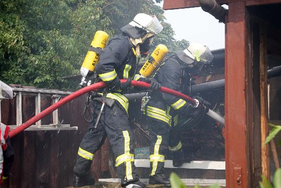 Foto_Thomas_Nyfeler_NMS_Grossfeuer_Gartenlauben_08Fotos: Th0mas Nyfeler + Maria Heidecke Text: Maria Heidecke – Neumünster (mhe) –  Am Samstagnachmittag  gegen 15:40 Uhr wurde die Berufsfeuerwehr Neumünster zu einem Großeinsatz in die Wasbeker Straße 288 gerufen. Eine dunkle Rauchsäule war bereits aus weiter Entfernung zu sehen. Es brannten zwei aneinander grenzende Gartenlauben, mit ca. 15m mal 3 Meter,  in voller Ausdehnung. Da sich direkt nebenan ein Trafohäuschen befindet wurden die Stadtwerke mitalarmiert. Vor Ort waren zusätzlich die Freiwilligen Feuerwehren Tungendorf Stadt, Tungendorf Dorf, Stadtmitte und der Rettungsdienst sowie die Polizei mit zwei Streifenwagen. Mit ca. 50 Kameraden vor Ort bekämpften die Einsatzkräfte, teilweise unter schweren Atemschutz,  das Großfeuer und konnten es schnell unter Kontrolle bringen. Trotzdem waren die Gartenlauben nicht mehr zu retten. Die beiden Besitzer der Gartenlauben beschlossen einstimmig, sie nicht wieder aufzubauen. Einer der beiden versuchte noch vergeblich mit seinem Gartenschlauch das Schlimmste zu verhindern, bis die Feuerwehr eintraf. Der Hauptgeschädigte musste hilflos zusehen (siehe Foto) wie seine große Laube niederbrannte. Es wird noch bis in die frühen Abendstunden dauern, ehe alle Glutnester gelöscht sind. Die Polizei leitete den Verkehr einspurig auf der Wasbeker Straße an den Einsatzfahrzeugen vorbei.  Gleichzeitig musste die Berufsfeuerwehr zu einem Einsatz in die Ohmstraße ausrücken. Dort schlug ein Heimrauchmelder Alarm, Fehlalarm wie sich dann schnell herausstellte. Die Brandursache ist noch unklar, die Polizei ermittelt und geht momentan von einem technischen Defekt aus. Die extreme drückende Hitze erschwerte den Einsatzkräften die Arbeit, Getränke wurden bereitgestellt und verteilt.