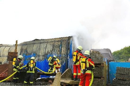 Bei Eintreffen der ersten Feuerwehren schlugen bereits die Flammen aus dem Dach. Die Löschmaßnahmen gestalteten sich schwierig, da die metallenen Außenwände zunächst nicht überwunden werden konnten, später wurden sie mithilfe einer Kettensäge und eines Baggers eingerissen, um ins Innere der Halle zu gelangen. Aufgrund der starken Rauchentwicklung löschten die Kameraden unter schwerem Atemschutz, teilweise kam auch Löschschaum zum Einsatz.