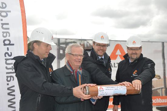Grundsteinlegung für modernes Bürogebäude an der Eric Warburg Brücke · Die ALTUS Bau GmbH legte am 09.10.2017 den Grundstein für das „Projekt Neues Hafenhaus an der Eric-Warburg-Brücke“ mit der Eschenburg Verwaltungsgesellschaft mbH & Co. KG und ihrem geschäftsführenden Gesellschafter Karl-Wolfgang Eschenburg und setzt damit auf den Standort Lübeck. Der Bauherr Wolfgang Eschenburg von der Eschenburg Verwaltungsgesellschaft mbH und die geschäftsführenden Gesellschafter der ALTUS Bau GmbH Klaus Eckelmann, Toralf Techel, Philip von Papen und Thomas Becker legten den gemeinsamen Grundstein im Beisein aller Angestellten der ALTUS Bau GmbH, den Fachplanern und Baubeteiligten, sowie weiteren Gästen. Am Fuße der Eric Warburg Brücke entstehen ca. 2.000 m2 Bürofläche, wobei der größte Teil (ca. 1.200 m2) von der ALTUS Bau GmbH später genutzt wird.
