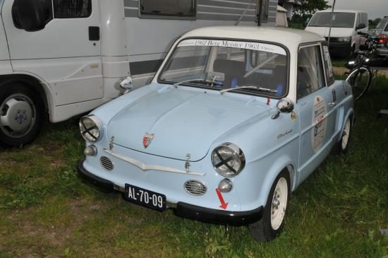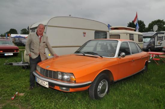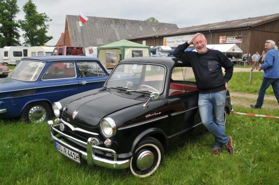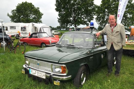 Martin Rehborn ist mit seinem schwarzen NSU Prinz 2 E – (Exportfahrzeug für die USA) auf die Ausstellung gekommen. Er erklärte Enno Freiherr von Ruffin sein Fahrzeug. “Das Auto hat 20 PS und 598 ccm Hubraum und schaut euch mal diese Stoßstangen an. Ich bin Mitglied des British NSU O.C.“ sagte der Dortmunder voller Stolz. Baron von Ruffin durfte sich auch in das “Kleine Schwarze“ setzen. Das Fahrzeug ist Baujahr 1959. Es wurde in die USA exportiert und vor 25 Jahren von einem Mann vom Technischen Hilfswerk zurück nach Deutschland geholt. Seine Eltern hatten eine NSU Tankstelle. Martin Rehborn hat ihm den Wagen vor 20 Jahren abgekauft und restauriert. Nun liebt er ihn über alles.