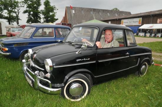 Martin Rehborn ist mit seinem schwarzen NSU Prinz 2 E – (Exportfahrzeug für die USA) auf die Ausstellung gekommen. Er erklärte Enno Freiherr von Ruffin sein Fahrzeug. “Das Auto hat 20 PS und 598 ccm Hubraum und schaut euch mal diese Stoßstangen an. Ich bin Mitglied des British NSU O.C.“ sagte der Dortmunder voller Stolz. Baron von Ruffin durfte sich auch in das “Kleine Schwarze“ setzen. Das Fahrzeug ist Baujahr 1959. Es wurde in die USA exportiert und vor 25 Jahren von einem Mann vom Technischen Hilfswerk zurück nach Deutschland geholt. Seine Eltern hatten eine NSU Tankstelle. Martin Rehborn hat ihm den Wagen vor 20 Jahren abgekauft und restauriert. Nun liebt er ihn über alles.