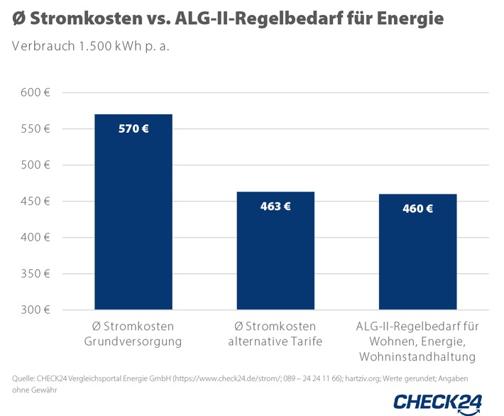 München (ots) – – 2021 steigt das Arbeitslosengeld II (ALG II) für Alleinstehende um 14 Euro auf 446 Euro p. M. – Durchschnittlicher Preis der Grundversorgung 24 Prozent über ALG-II-Regelbedarf für Strom Ab 1. Januar 2021 erhalten Empfänger von Arbeitslosengeld II höhere Bezüge.* Doch obwohl Alleinstehende im kommenden Jahr 14 Euro monatlich mehr bekommen, zahlen Hartz-IV-Empfänger im Durchschnitt 110 Euro im Jahr mehr für Strom in der Grundversorgung (https://www.check24.de/strom-gas/grundversorgung-ersatzversorgung/) , als das ALG II vorsieht. Die Hartz-IV-Pauschale für Wohnen, Energie und Wohninstandhaltung beträgt 2021 monatlich 38,32 Euro**. 1.500 kWh Strom kosten in der Grundversorgung durchschnittlich 47,50 Euro. Damit liegen die Stromkosten 24 Prozent über dem Regelbedarf. „Die Lücke zwischen Energiepauschale und den tatsächlichen Stromkosten für Hartz-IV-Empfänger ist nochmals größer als im Vorjahr“ , sagt Lasse Schmid, Geschäftsführer Energie bei CHECK24. „Die anhaltenden Rekordpreise für Strom werden durch die Erhöhung des ALG-II-Regelsatzes nicht ausgeglichen.“ Durch einen Wechsel zu einem der zehn günstigsten Alternativtarife reduzieren Stromkunden ihre monatlichen Kosten auf 38,58 Euro und liegen damit noch immer knapp über dem Regelbedarf. 96 Grundversorger erhöhen zum 1. Januar 2021 den Strompreis 96 Grundversorger erhöhen Anfang kommenden Jahres den Strompreis (https://www.check24.de/strom/strompreise/) . Im Durchschnitt betragen die Preiserhöhungen 2,4 Prozent und betreffen rund 600.000 Haushalte. Für einen Musterhaushalt mit einem Verbrauch von 5.000 kWh bedeutet das zusätzliche Kosten von durchschnittlich 39 Euro pro Jahr. 111 Grundversorger haben eine Preissenkung angekündigt – im Schnitt um 1,8 Prozent. Davon profitieren rund eine Million Haushalte. „Auch im kommenden Jahr müssen Verbraucher mit Rekordstrompreisen rechnen“ , sagt Lasse Schmid, Geschäftsführer Energie bei CHECK24. „Wirklich sparen können Verbraucher nur, wenn sie selbst aktiv werden und ihren Anbieter wechseln.“ Der Strompreis befindet sich nach wie vor auf sehr hohem Niveau. Aktuell zahlen Verbraucher in der Grundversorgung für 5.000 kWh Strom 1.613 Euro. Bei den Alternativversorgern kostet die gleiche Menge 1.301 Euro (-19 Prozent). *Quelle: tagesschau.de „Bundesrat billigt Erhöhung von Hartz IV“ https://www.tag esschau.de/inland/bundesrat-stimmt-fuer-erhoehung-von-hartz-iv-regelsaetzen-101. html [abgerufen am 8.12.2020] **Quelle: hartziv.org https://www.hartziv.org/regelbedarf.html [abgerufen am 8.12.2020]; Die regelbedarfsrelevanten Verbrauchsausgaben basieren auf der Einkommens- und Verbrauchsstichprobe (EVS) 2018. Die EVS wird nur alle 5 Jahre vom Statistischen Bundesamt durchgeführt. ***Die vollständige Studie der WIK-Consult mit weiteren Ergebnissen unter: https://www.wik.org/fileadmin/Studien/2018/2017_CHECK24.pdf Pressekontakt: Edgar Kirk, Public Relations Manager, Tel. +49 89 2000 47 1175, mailto:edgar.kirk@check24.de Daniel Friedheim, Director Public Relations, Tel. +49 89 2000 47 1170, mailto:daniel.friedheim@check24.de Weiteres Material: http://presseportal.de/pm/73164/4789301 OTS: CHECK24 GmbH Original-Content von: CHECK24 GmbH, übermittelt durch news aktuell