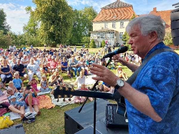Fotos und Text: TBF/Holger Kasnitz ·Heute, 14.08. 2022 von 15–18 Uhr mit Rolf Zuckowski. Eine Veranstaltung vom Kulturkreis Hasselburg e.V. FamilienTag für Klein und Groß mit Rolf Zuckowski auf dem KULTUR GUT HASSELBURG im Barockgarten des Herrenhauses auf dem Kultur Gut Hasselburg. „Wenn der Sommer kommt“ heißt eines der beliebten Lieder von Rolf Zuckowski, „Wie gut, dass es die Sonne gibt“ ein anderes. Etwa 700 Gäste kamen zum Fest, Walking Acts, Klassik für Kinder, musikalische Mitmach-Theaterstücke, Lindgren Lesungen und natürlich ein Konzert mit dem bekannten Hamburger Liedermacher Rolf Zuckowski fanden statt. Die „Sommerkinder“ dürfen sich am Nachmittag auf ihn freuen und tüchtig mitsingen. Und bei einem Lied taten sich die Kinder zusammen, stürmten auf die Bühne und sangen kräftig mit.