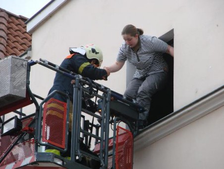 Fotos: TBF/Holger Kröger – Gegen 11:40 Uhr kam es in der Lübecker Innenstadt zu einem Feuer in einem viergeschossigen Haus. Ein beherzter Lkw-Fahrer half bei der Rettung der Anwohner. Weitere gelangte über Drehleitern ins Freie. Besser hätte es nicht laufen können. Als gegen 11:37 Uhr am heutigen Donnerstag, 26. April 2011, ein Funkstreifenwagen die Fleischhauerstraße befuhr gingen die Notrufe bei der Feuerwehr und Polizei ein. Ein Feuer in einem viergeschossigen Haus in der Fleischhauerstraße wurde gemeldet. Es brannte offenbar im Erdgeschoß des Hauses. Mehrere Anwohner hielten sich in den darüber liegenden Etagen auf. Ein zufällig anwesender 37-jähriger Lkw-Fahrer hörte die Rufe der Anwohner und fuhr seinen 7,5-Tonner direkt an das Haus. Er stellte eine mitgeführte Leiter auf die Ladefläche und so konnten drei Personen ins Freie gelangen. Weitere sechs Anwohner und ein Hund konnten dann über Drehleitern aus dem Haus gerettet werden. Alle Anwohner wurden medizinisch vor Ort versorgt – drei wurden vorsorglich in Lübecker Krankenhäuser gebracht.