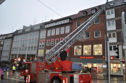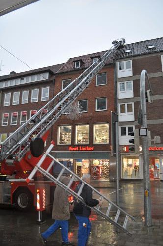 Fotos: TBF/Holger Kröger – Nun wirbelt Sturmtief „Andrea“ um die Strassen und Häuser herum. Aufgrund loser Dachziegel, welche zum Teil bereits durch Windböen von einem fünfgeschossigen Eckhaus in der Holstenstraße am heutigen Donnerstag, 05. Januar 2012, heruntergeweht waren, wird durch die Verkehrssicherung der Hansestadt Lübeck die Holstenstraße ab Einmündungsbereich Schüsselbuden/Schmiedestraße und An der Untertrave/-Obertrave für den Fahrzeugverkehr sowie Passanten voll gesperrt. „siehe weitere Fotos>>>!“ Zur Sicherung des Daches muss ein Gerüst aufgebaut werden, damit eine Dachdeckerfirma die Arbeiten durchführen kann. Ortskundige werden gebeten, den betroffenen Bereich weiträumig zu umfahren.