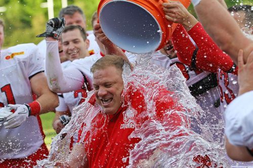 Wasserdusche für Defense Coordinator Florian Darnehl, der am Spieltag 39 Jahre jung wurde. Foto: Kugel