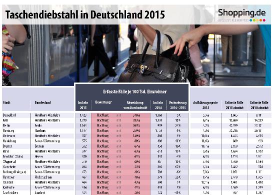 Es ist der Schreckmoment schlechthin: Beim gemütlichen Shoppen in der Stadt gibt es einen Rempler oder eine Unachtsamkeit und die Tasche oder deren Inhalt ist weg. Doch so schnell wie der Dieb zuschlägt, ist er auch wieder weg. Im Jahr 2015 wurden in 76 deutschen Großstädten im Schnitt mehr als 379 Taschendiebstähle pro Tag bei der Polizei erfasst – insgesamt 138.477. Hochburgen des Taschendiebstahls sind dabei die Metropolen Düsseldorf mit 1.423 Taschendiebstählen je 100 Tausend Einwohner, Köln (1.229), Berlin (1.164), Hamburg (1.147) und Dortmund (767). Das ergab eine Auswertung der Polizeilichen Kriminalstatistik für 2015 durch das Einkaufsportal Shopping.de. Weitere Informationen siehe Tabelle.
