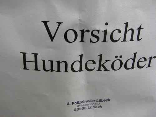 „Noch ist nach unserem Wissen kein Tier zu Schaden gekommen“, beruhigt der Polizeisprecher der Lübecker Polizei, „aber Hundehalter sollten ihre Tiere im Auge behalten und darauf achten, ob sie abseits des Weges etwas fressen.“
