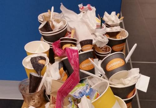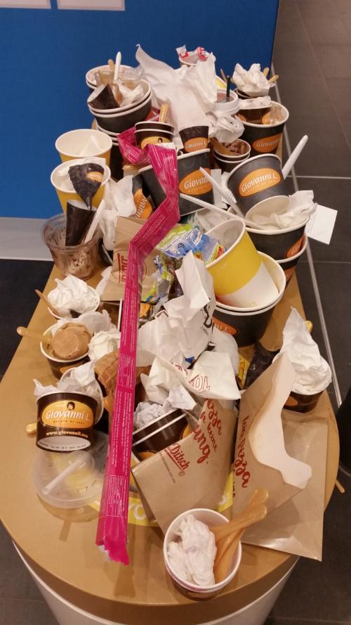 Ich war entsetzt, was ich da sah, eine Müllhalde auf der Abdeckung von mehreren neben einander stehenden Mülleimern, mitten drin, auf der Freifläche von Villeroy&Boch, IKEA und dem neuen Eisladen GiovanniL?
