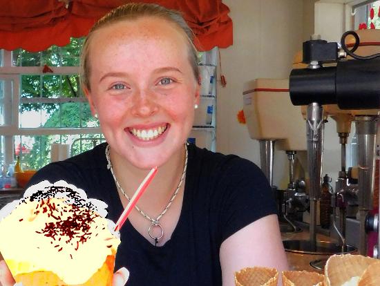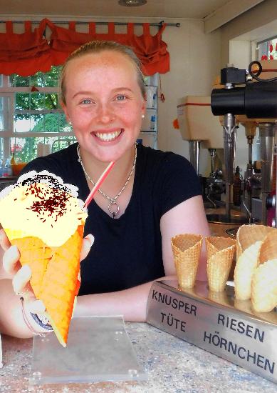 3 Sorten werden verkauft: (Vanille, Erdbeer und Schokolade, das Eis ist ein Mittelding zwischen „normalem“ und softigen Eis) und wirklich sehr lecker. Und die Portionen können sich sehe lassen, Caprice zeigt hier ein Vanille-Eis mit Sahne und Schoko-Streuseln.