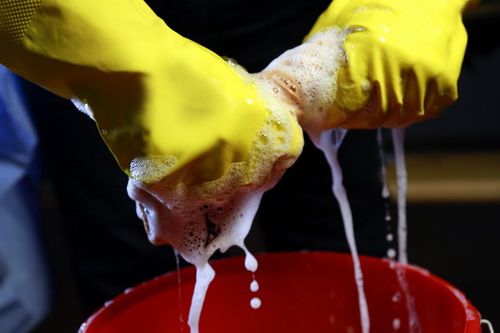Wienern, wischen, wringen: Viele Gebäudereinigerinnen putzen immer mehr Fläche – ohne mehr Geld. Jetzt soll das „Turbo-Putzen“ am Tariftisch geregelt werden. Ebenso wie ein „sauberes Lohn-Plus“: Die Gebäudereiniger-Gewerkschaft IG BAU fordert 80 Cent mehr pro Stunde. FOTO: IG Bau