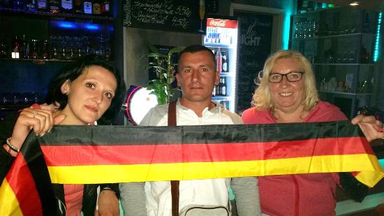 Text und Fotos: TBF/Holger Kasnitz – My Night Lokal in 23554 Lübeck, Friedenstraße 45 am 12. Juni 2016. Fußballspiel Deutschland – Ukraine. Wir alle sind für Deutschland. My Night Lokal in 23554 Lübeck, Friedenstraße 45 beim Fußballspiel Deutschland vs. Ukraine am 12.06.2016.V.l.n.r. Helena Mituskin ist in Sibirien Russland geboren.Ich bin Deutsche und ich bin für Deutschland. Das Fußballspiel England – Russland fand ich sehr hart und das Geschehen in Marseille war brutal, das hat nichts mit Fußball zutun. Roberto Manzo aus Italien sagt: ich wohne in Deutschland und bin für die Deutsche Nationalmannschaft. Christine Christiansen kommt aus Westerland von der Insel Sylt. Wohnt in Lübeck und hat eine Reinigungsfirma. Ich bin für Deutschland wir alle hier sind für Deutschland. Der Wirt Branko Buzov kommt aus Kroatien. Er sagt: ich bin für Kroatien und für Deutschland. Hier kann jeder herkommen, egal welcher Nationalität er ist und für welche Fußballmannschaft er jubelt. Ich habe noch Platz für Dartmannschaften. Die können hier in meinem Lokal ein neues Zuhause finden und Fußball gucken dürfen die Darter auch.