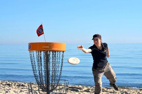 Bildbeschreibung: Sportlich unterwegs: In Kellenhusen gibt es die größte Discgolf-Anlage Deutschlands – Rechte: Kellenhusen Streetsurfen, Waveboarden, Xliden, Skiken oder Discgolf – das sind die Sportarten von Morgen. Urlauber, die es aktiv, abwechslungsreich und rasant mögen, können diese Trendsportarten in Kellenhusen ausprobieren. Das Ostseebad zwischen Wald und Wellen hat sich in den letzten Jahren einen Namen als Trendsportort gemacht. Die Showcreation /Sport-Entertainment GbR steht seit 2010 mit der Marke „Ostseeanimation“ für professionelle Freizeitangebote an der Küste. Neueste Trends kommen aus aller Welt. Diese Sportarten machen nicht nur Spaß sondern fördern Gesundheit und Fitness – und das vor schönster Kulisse. Das Ostseebad Kellenhusen ist bekannt für seine abwechslungsreiche und intakte Natur.