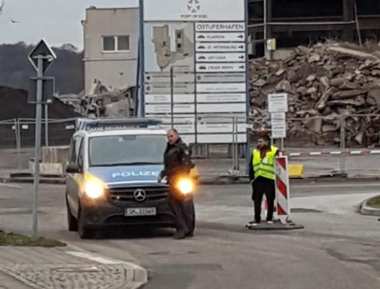 IMG-20181214-WA0027Kiel: Text: Holger Kasnitz · Fotos: Micky · Weltkriegsbombenentschärfung · In Kiel ist am Ostuferhafen am Dienstag, 18. Dezember 2018, bei Bauarbeiten eine amerikanische 250 Kilo Bombe aus dem 2. Weltkrieg gefunden worden. Micky aus Lübeck kam gerade mit ihrem Lkw vorbei und wurde von der Polizei gestoppt. Über eine Stunde musste Sie dort warten. Zwischendurch kam der Kampfmittelräumdienst und begutachtete die Bombe. (Siehe Bildergalerie Seite 2) >>>>Die Fundstelle: Ostuferhafen / Grenzstraße in der Nähe der Fachhochschule Kiel. Ab 12.00 Uhr wurden keine Personen mehr in das betroffene Gebiet hineingelassen.