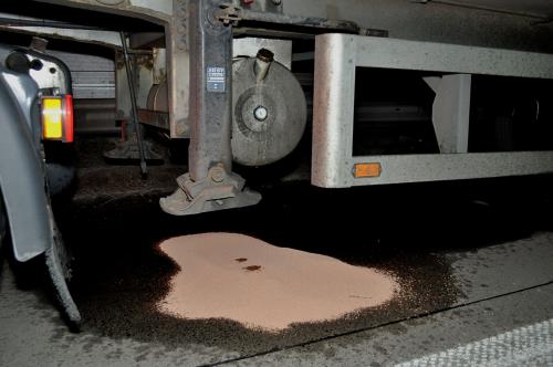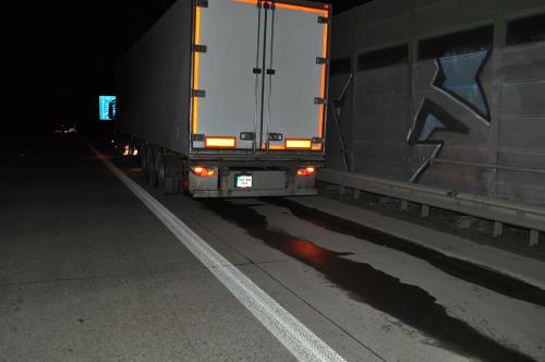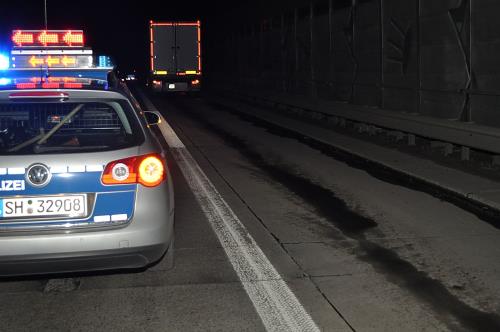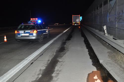 Text und Fotos: TBF/Holger Kröger – Die Auffahrt Stockelsdorfer Strasse zur A1 nach Hamburg ist voll gesperrt, weil ein 40-Tonner spät am Abend, über einen Metallgegenstand fuhr. Dabei hat er sich den Dieseltank aufgerissen. Es kam zu einer kilometerlangen Dieselspur, bis kurz vor der Abfahrt Moisling. Auch ein PKW fuhr über dies Metallstück und riß sich die Ölwanne auf, so die Polizei vor Ort. Dieser Wagen wurde schon abgeschleppt. Die rechte Fahrbahnseite ist teilweise für Reinigigungarbeiten gesperrt. Mehrere Streifenwagen stehen auf der Autobahn mit Blaulicht und warnen die Autofahrer. Inzwischen sind Spezial-Reinigungsfirmen vor Ort und reinigen die Dieselspur zu entfernen. „weitere Fotos, folge dem Link>>>!“ Der Verkehr wird an der Unglücksstelle einspurig vorbeigeführt. die Arbeiten sollen bis in die Morgenstunden dauern.
