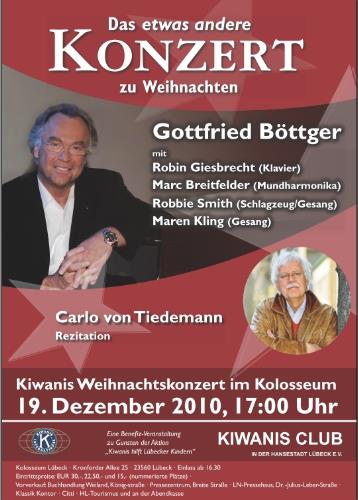…mit Gottfried Böttger und Carlo von Tiedemann – Sonntag, 19. Dezember 2010, 17 Uhr – Kolosseum Lübeck – Am vierten Adventssonntag (19. Dezember) lädt der Kiwanisclub in der Hansestadt Lübeck zu einem unterhaltsam-heiteren Abend ein. Die bekannten Künstler Gottfried Böttger und Carlo von Tiedemann gestalten im Kolosseum ein weihnachtliches Programm für die ganze Familie. Unterstützt werden sie von Robin Giesebrecht (Klavier), Marc Breitfelder (Mundharmonika), Robbie Smith (Schlagzeug, Gesang) und Maren Kling (Gesang). Die Benefizveranstaltung „Kiwanis hilft Lübecker Kindern“ beginnt um 17 Uhr. Karten gibt es in den bekannten Vorverkaufsstellen (u.a. Buchhandlung Weiland, Pressezentrum, LN-Pressehaus) zum Preis von 30 Euro/22,50 Euro/15 Euro.