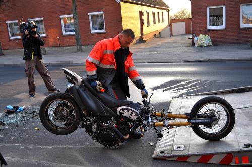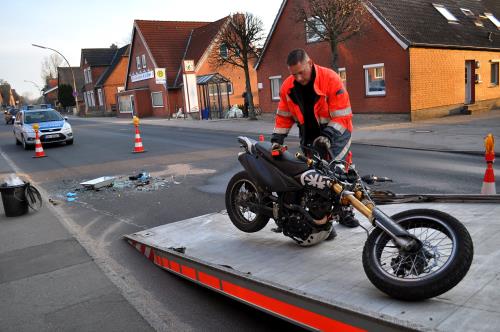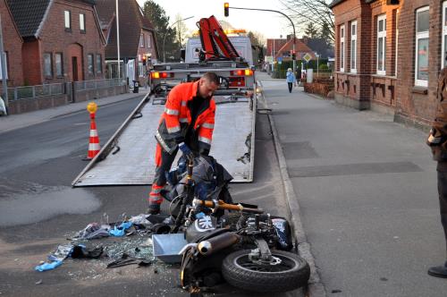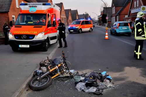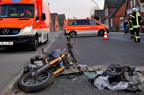 Text: hanseatic news – Fotos: TBF/Holger Kröger – Groß Grönau- Montagmorgen kam es auf der B 207 in der Ortsdurchfahrt Groß Grönau zu einem schweren Verkehrsunfall. Ein 18-Jähriger Lübecker befuhr die B 207 in Richtung Ratzeburg, als er in Höhe eines Bäckers in das Heck eines stehenden BMW Geländewagen raste. Der Fahrer des Geländewagen hatte sein Fahrzeug abgestellt um Brötchen beim Bäcker zu kaufen. Der Kradfahrer blieb nach dem Unfall regungslos auf der Straße liegen. Lebensgefährlich verletzt, mit Knochenbrüchen und einem Schädelhirntrauma wurde der 18-Jährige in ein Lübecker Krankenhaus eingeliefert.