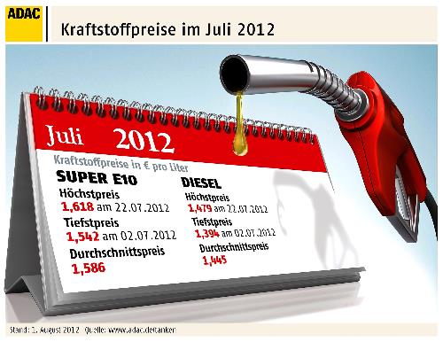 Teuerster Tag zum Tanken war laut ADAC im vergangenen Monat der 22. Juli. Super E10 kostetet an diesem Tag 1,618 Euro je Liter, Diesel 1,479 Euro. Am günstigsten tankten die Autofahrer am 2. Juli. Der Tagesdurchschnittspreis für E10 lag damals bei 1,542 Euro, Diesel bei 1,394 Euro.