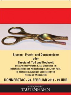 Das satirische Jugendwerk des Dichters Jean Paul ist Thema einer Lesung im Antiquariat Tautenhahn. „Blumen-, Frucht- und Dornenstücke. Oder: Ehestand, Tod und Hochzeit des Armenadvokaten F. St. Siebenkäs im Reichsmarkflecken Kuhschnappel“ wird am Donnerstag, dem 24. Februar von Hermann Wiedenroth in den Räumen des Antiquariats in Auszügen vorgestellt.