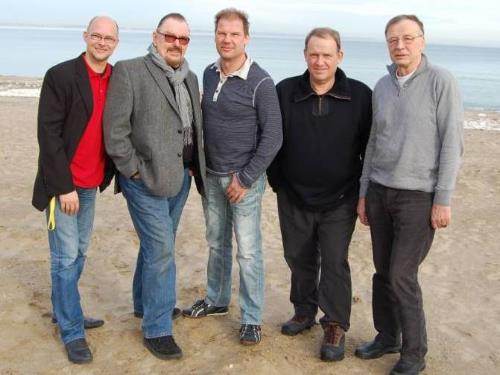 BU zum Foto: Die Timmendorfer Künstler wehren sich gegen die Vorwürfe von Kulturausschuss-Vorsitzenden Joachim Nickel und fordern seinen Rücktritt als Vorsitzender (v.l.n.r.); Discjockey und Musikmoderator René Kleinschmidt, Entertainer Peter Strothmann, Musicalsänger Andreas Wallbruch, Entertainer Jörn Langbehn („Küsten-Jörn“) und Dietrich Fritz, Vorsitzender vom Shanty-Chor Timmendorfer Strand (Foto: KG/der reporter)
