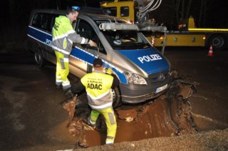 Die Straße war durch den unterirdischen Wasserrohrbruch so aufgeweicht und unterspült worden, dass die Fahrbahndecke das Gewicht des großen Polizeibusses nicht mehr tragen konnte und einfach nachgab. Die Polizeibeamten bekamen zwar einen ordentlichen Schreck, konnten aber das „sinkende Schiff“ trockenen Fusses verlassen. Ein Abschleppunternehmer kümmerte sich wenig später um den festsitzenden Polizeibus „Ich mache das schon 41 Jahre mit meiner Firma, da kommen am laufenden Band Kuriositäten vor, aber an einen Polizeiwagen kann ich mich nicht erinnern“. Die Stadtwerke konnten das Leck danach mit Hilfe eines Baggers frei legen und abdichten. Immerhin hatte der Rohrbruch in rund 100 Haushalten für einen trockenen Wasserhahn gesorgt.