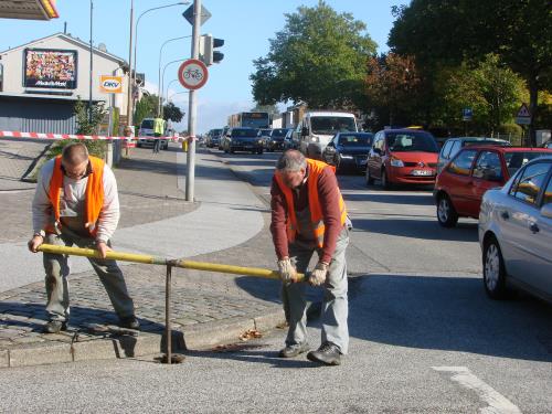Fotos: TBF/Holger Kröger – In der Schwartauer Allee kam es gestern zu einem Rohrbruch, weil eine Wasserleitung riss. Die vollkommen überflutete Straße musste teilweise völlig gesperrt werden. Es kam zu Hochwasser in der viel befahrenen Strasse – nichts ging mehr. An der Ecke zur Triftstraße war gestern Vormittag ein Rohr gerissen, die vierspurige Ausfallstraße überflutete, wobei sich in einer Senke Wassermassen bildeten, kurzzeitig entstand sogar ein richtiger See. Der Entstördienst der Stadtwerke rückte aus, die Polizei sperrte zwei Spuren der Straße.In der ganzen Umgebung gab es kein Wasser mehr in den Häusern, Das Wasser stand bis auf den Gehweg.Der Entstördienst der Stadtwerke und die Polizei trafen zeitgleich am Unfallort ein. An der Ecke Schwartauer Allee/Triftstraße klaffte ein riesiges Loch im Fahrradweg. Ein Hauptrohr mit 30 Zentimetern Durchmesser war geplatzt. „Die Schieber konnten in dem Bereich schnell geschlossen werden“, so Stadtwerke-Sprecherin Erika Bünz. Gegen 11.10 Uhr stoppte der stete Wasserstrom, in den Haushalten stieg der Druck wieder.