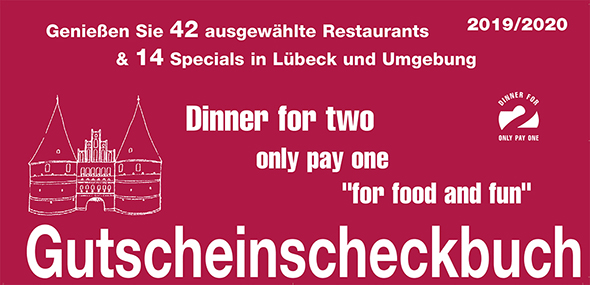 Symbolfotos: (TBF) Ist es nicht herrlich, gerade jetzt, in der Vorweihnachtszeit, aber auch im Jahr 2020, mit 2 Personen im Bereich Lübeck und Umgebung lecker Essen und Trinken zu gehen und nur für eine Person zu bezahlen: Jetzt gibt es wieder das beliebte Gutscheinscheckbuch Dinner for two 2019/2020 Lübeck. Das Gutscheinbuch für Lübeck und Umgebung ist ab Ende Oktober im Handel erhältlich. Online bestellen Folgende Restaurants und Firmen laden Sie herzlich zum Schlemmen ein: