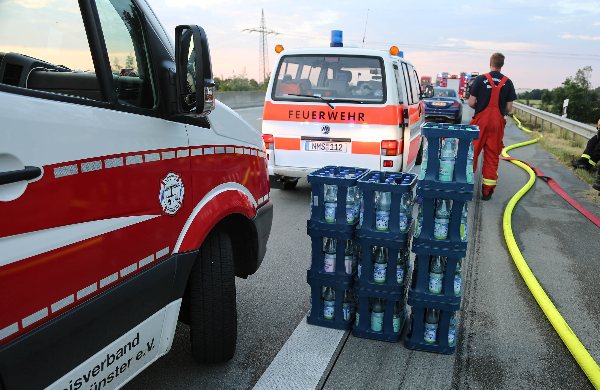 Vor Ort brannte ein LKW, beladen mit hochwertigen neuen PKW, darunter zwei Elektroautos und ein Hybridfahrzeug. Außerdem brannte bereits ein Teil der Böschung neben den Fahrstreifen. Die Löschwasserzufuhr gestaltete sich schwierig, konnte aber über einen Brunnen gewährleistet und so das Feuer schnell gelöscht und ein ausgedehnter Flächenbrand verhindert werden. Nach ersten Vermutungen war ein Reifenbrand des LKW Anhängers ursächlich für das Feuer, welcher sich dann sehr schnell auf das gesamte Fahrzeug und seine Ladung ausgebreitet hatte. Zumindest gab es keine Verletzten und die Batterien der Elektroautos gerieten nicht in Brand und wurden nicht beschädigt. An dem LKW Anhänger sowie an sechs der acht geladenen PKW entstand ein Totalschaden, die  Zugmaschine sowie die zwei weiteren PKW wurden beschädigt. Jedoch sorgte der Einsatz für erhebliche Verkehrsbehinderungen. Zunächst wurden wegen der Explosionsgefahr beide Fahrtrichtungen der A7 voll gesperrt, die Fahrzeuge wurden in Neumünster Nord bzw. Neumünster Mitte abgeleitet, was zu Staus führte. Die Fahrtrichtung Süd ist mittlerweile wieder frei gegeben. Die Bergungsarbeiten werden jedoch noch mehrere Stunden in Anspruch nehmen, in denen die Autobahn in Fahrtrichtung Norden gesperrt bleiben wird. Das DRK und die Regieeinheit versorgte die Einsatzkräfte und Personen in den wartenden Autos im Stau bei schwül-heißen Außentemperaturen bei Gewitter und Regen und um 27 Grad Celsius im Schatten mit Wasser und Schokoriegeln. Die Rauchsäule, ausgelöst durch den Brand, war bis ins Neumünsteraner Stadtgebiet zu sehen.
