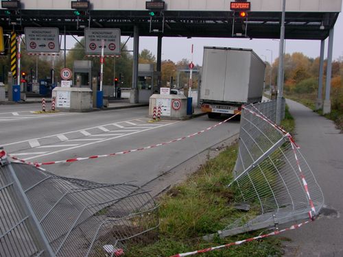 Fotos: TBF/Holger Kröger – Heute Morgen gegen 6:30 Uhr fuhr ein russischer Lkw-Fahrer mit seinem 40-Tonner an der Maut Station in die falsche Box. Der Kassierer sagte, er möge eine andere Durchfahrtbox benutzen. Daraufhin setzte der Lkw-Fahrer zurück, lenkte den Lkw quer zurück und durchbrach den Zaun am Herrentunnel. Dann fuhr er in die äußerste rechte Durchfahrtbox in Richtung Lübeck.