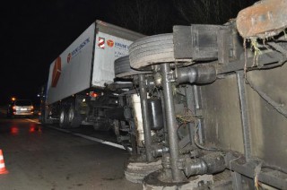 Fotos: TBF/Holger Kröger – Zu zwei LKW Unfällen auf der A226, Höhe Lübeck, kam es gegen Mittag des gestrigen Heiligen Abend. Ein 40-Tonner und ein LKW mit Anhänger kamen auf sehr glatter Straße von der Fahrbahn ab und rutschten in den Graben. Verletzt wurde niemand. Die Aufräumarbeiten dauerten Stunden. Am frühen Morgen des Heiligabend geriet ein voll beladener Lastzug auf der A 226 in Richtung Travemünde kurz nach der Abfahrt von der A 1 auf spiegelglatter Fahrbahn ins Schleudern. Dabei konnte der Fahrer den LKW nicht mehr unter Kontrolle bringen, der Anhänger stürzte um und wurde stark beschädigt. Ein vollbeladener Sattelzug aus Spanien kam beim Versuch, dem Anhänger auszuweichen, ins Rutschen und kippte seitlich in den Straßengraben.