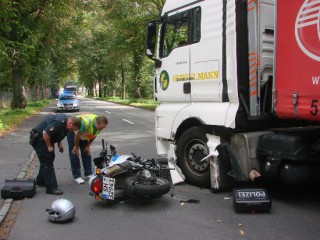 Fotos: TBF/Holger Kröger – Zu einem schweren Verkehrsunfall kam es heute in der Mecklenburgerstrasse: Ein Polizist war kurz nach 14 Uhr auf seinem Motorrad auf dem Weg nach Schlutup zu einem Einsatz unterwegs. Auf der langgezogenen Mecklenburger Straße wollte er einen Lkw überholen. Der Lkw-Fahrer übersah den Motorradfahrer offensichtlich, denn der Brummifahrer wollte gerade auf das Firmengelände einbiegen wollte.Der Polizeibeamte prallte mit seinem Motorrad gegen die Zugmaschine des Lkws und wurde schwer verletzt. Die Mecklenburger Straße war fast 2 Stunden gesperrt, vier Streifenwagen waren im Einsatz, um den Verkehr zu regeln. Ob der Polizist mit Blaulicht unterwegs war, konnte noch nicht geklärt werden.