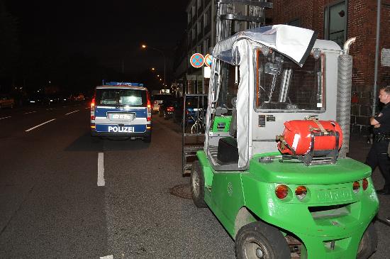Gabelstapler 011Fotos: TBF/Holger Kröger – Heute früh gegen 4:00 Uhr bekam die Lübecker Polizei einen Anruf, dass an der Untertrave Ecke Clemensstrasse ein gasbetriebener großer Gabelstabler die Fahrbahn blockiert. Als die Polizisten am Einsatzort eintrafen, stand dort tatsächlich ein Gabelstabler mit ausgefahrener Gabel nach oben mitten auf der Strasse. Der Schlüssel steckte noch.Die Polizei vermutet, dass der Gabelstabler gestohlen wurde. Da eine Fahrbahnseite blockiert war, musste ein Abschleppdienst gerufen werden. Dieser schleppte das hochwertige Gerät ab.