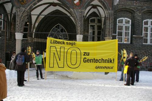 Nach dieser Aktion marschierte die Greenpeace Gruppe mit den gesammelten Unterschriften zum Lübecker Rathaus und platzierte sich um 14.00 vor dem Haupteingang in der Fußgängerzone. Präsentiert wurde dort ein Banner 2 X 4 m mit der Aufschrift: „Lübeck sagt NO“ zur Gentechnik was zu weiteren Gesprächen mit Lübecker Bürgern führte..
