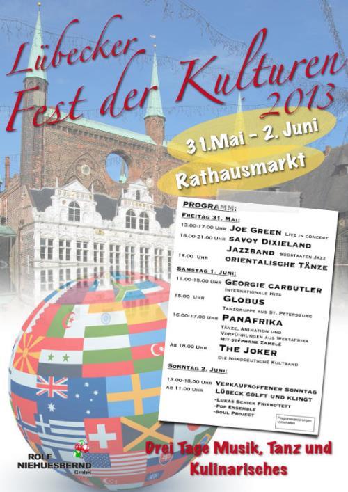 Ort: Lübecker Rathausmarkt – Zeit: 31.Mai bis 2.Juni 2013, täglich ab 11.00 Uhr Thema: interkulturelle Begegnung mit Musik, Tanz und Kulinarischem. Auch in diesem Jahr, vom 31. Mai bis 2.Juni 2013 wird auf dem Lübecker Rathausmarkt das Fest der Kulturen stattfinden. Nachdem es im letzten Jahr mit Italien einen Länderschwerpunkt gab, soll die Veranstaltung dieses Jahr ganz im Zeichen der interkulturellen Begegnung stehen. Auf dem Lübecker Rathausmarkt wird es also ein Wochenende lang bunt zugehen.Livemusik und Tanzeinlagen auf der großen Zentralbühne und internationale Spezialitäten. Am Freitag stehen unter anderem Dixieland Jazz und orientalische Tänze auf dem Programm. Samstag wird die Tanzgruppe Globus aus St. Petersburg zu Gast sein und der Choreograph Stéphane Zamblé zeigt mit seinem Panafrika Ensemble Tänze aus Westafrika. Samstag Abend wird dann die Norddeutsche Kultband The Joker für ausgelassene Feierstimmung sorgen.