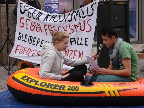 Fotos und Text: TBF/Holger Kröger – Wir alle haben die dramatischen Bilder von Mittwoch vor Augen! Vermutlich ertranken fast 300 Frauen, Männer und Kinder einige 100 Meter vor der Küste von Lampedusa, als ihr Boot kennterte.Auch Stefan Schmidt, Kapitän a. D., der mit dem Schiff Cap Anamur Flüchtlinge rettete und damals dafür verhaftet wurde, demonstriert am Sonnabendmorgen in Lübeck.