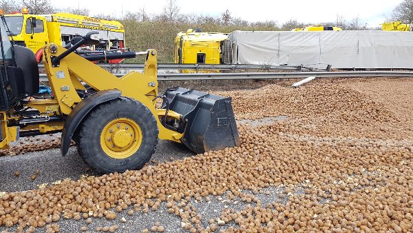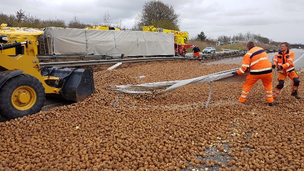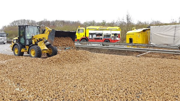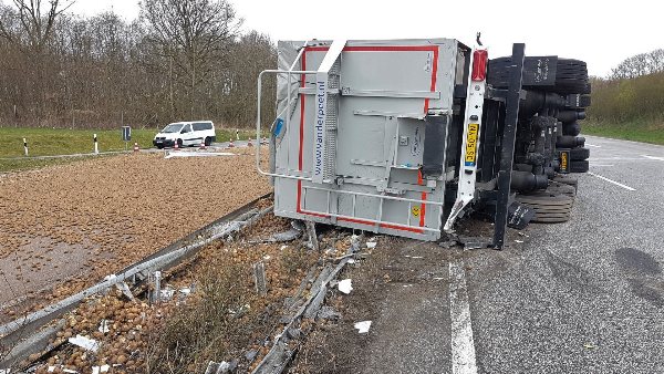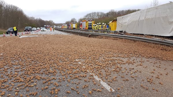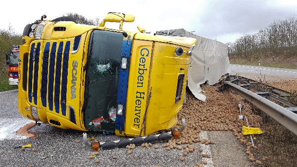 Nach derzeitigem Erkenntnisstand befuhr ein 58-jähriger Holländer mit einem Sattelzug die BAB 20 in Richtung Bad Segeberg. Kurz hinter dem Rastplatz „Auf dem Karkfeld“ verlor er die Kontrolle über das Fahrzeuggespann. Der Sattelzug kippte auf die Mittelleitplanke und die geladenen Kartoffeln verteilten sich auf der gesamten Gegenfahrbahn (Richtung Rostock). Bei dem Unfall wurde der Fahrer leicht verletzt. Die Autobahn musste in Fahrtrichtung Bad Segeberg zwischen den Anschlussstellen Lübeck Süd und Genin voll gesperrt werden. In Fahrtrichtung Rostock wird der Verkehr über den Rastplatz „Auf dem Karkfeld“ umgeleitet.