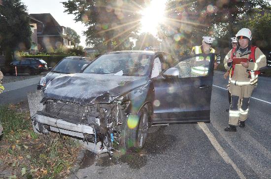 Text und Fotos: TBF/Holger Kröger – Lübeck, Schwerer Verkehrsunfall Walderseestraße – Zu einem schweren Unfall kam es am Mittwochmorgen gegen 7.20 Uhr in der Walderseestraße- Ein Audi geriet außer Kontrolle, schoss zwischen den Alleebäumen durch auf Geh- und Radweg, zurück quer über die Fahrbahn und kam an einem Poller zum Stehen. Ein Mann konnte sich in letzter Sekunde retten.