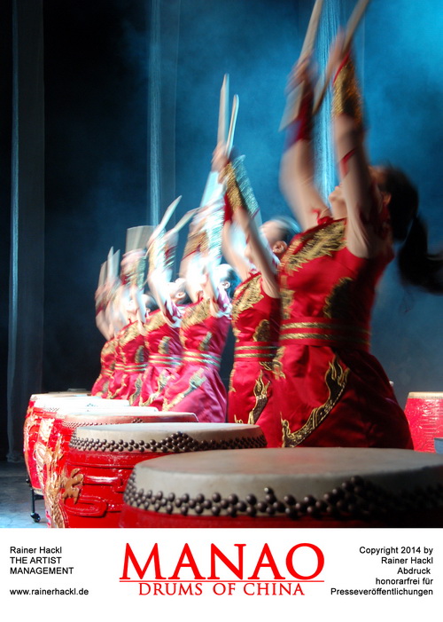 Als hätten sie nie etwas anderes gemacht, schlagen die jungen Frauen von MANAO die straff gespannten Felle in temperamentvollen Rhythmen mit Leidenschaft und Feuer. Laut und imposant, aber auch zart und gedämpft. Alte, chinesische Trommelkunst verpackt in eine Bühnenshow, welche die musikalischen Themen durch modernste Lichttechnik und gezielt eingesetzte Effekte eindrucksvoll in Szene setzt. Diese Komposition regt die Fantasie an und lässt uns eintauchen in eine mystische, fremde Welt.