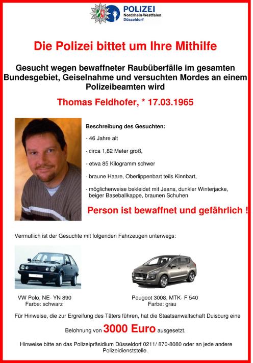 Der PKW landete im Graben, bei Thomas Feldhofer klickten die Handschellen. Weitere Hintergründe wollte die Polizei bisher nicht preisgeben. „weitere Fotos, folge dem Link>>>!“ Thomas Feldhofer werden mehrere Verbrechen zur Last gelegt, unter anderem mehrere Banküberfälle für die er bereits von 2001-2008 im Gefängnis saß und in Hessen kaperte er einen Linienbus. Er gilt als meistgesuchter Verbrecher Deutschlands und nach ihm wurde europaweit gefahndet.
