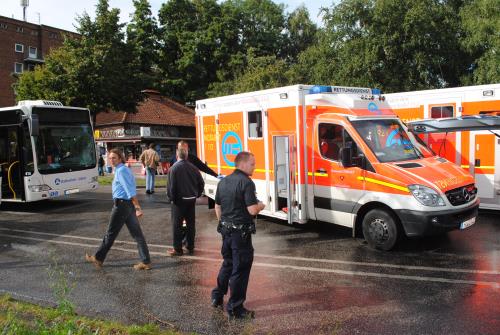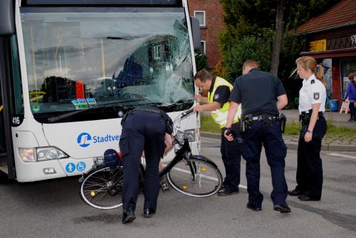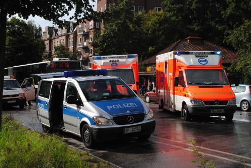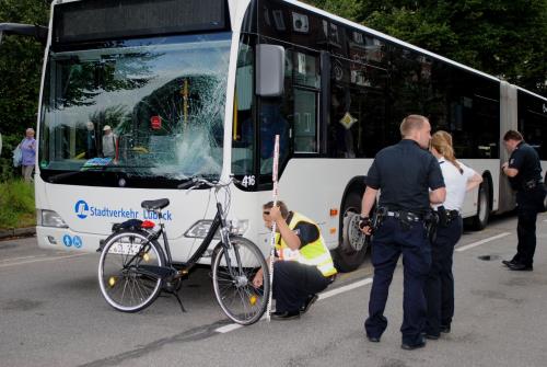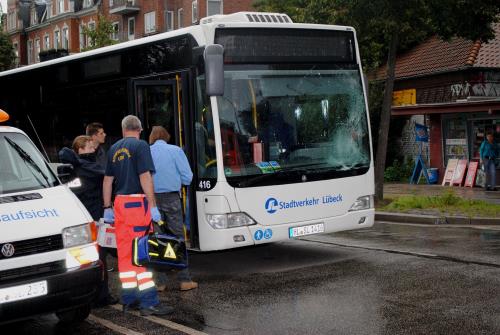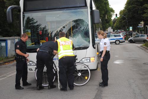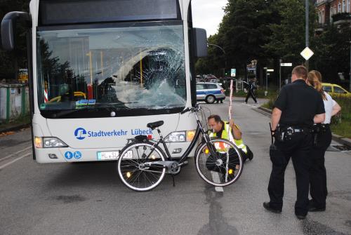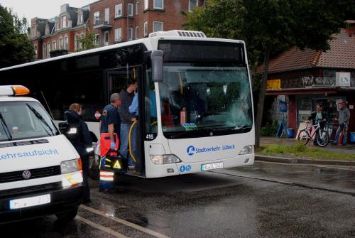 Fotos: TBF/Holger Kröger – Heute, kurz vor 16.00 Uhr, kam es zu einem schweren Unfall auf der Moltkebrücke. Wie bisher bekannt wurde, soll ein älterer Radfahrer unvermittelt vom Radweg auf die Fahrbahn gewechselt haben. Der Mann wurde direkt vom Bus erfasst und erlitt lebensgefährliche Kopfverletzungen.Der Radfahrer war, von der Moltkestrasse Richtung Marli unterwegs. Zeugen sagten, dass der Mann, kurz vor der Brücke im rechten Winkel auf die Fahrbahn gefahren sein soll – direkt vor den Gelenkbus des Stadtverkehrs. Obwohl die Busfahrerin sofort reagierte und eine Vollbremsung machte, stieß der Radfahrer mit seinem Kopf gegen die Fontscheibe und blieb mit schwersten Kopfverletzungen auf dem Asphalt liegen. Polizei und 2 Rettungswagen waren kurze Zeit später vor Ort und versorgten den Radfahrer und die Busfahrerin, die unter schwerem Schock stand. Den Unfall nahmen Polizeibeamte des ehemaligen Unfalldienstes auf. Dann wurde der mann mit lebensbedrohenden Verletzungen ins Krankenhaus gebracht. Nähere Einzelheiten zu seinem jetzigen Gesundheitszustand sind nicht bekannt.