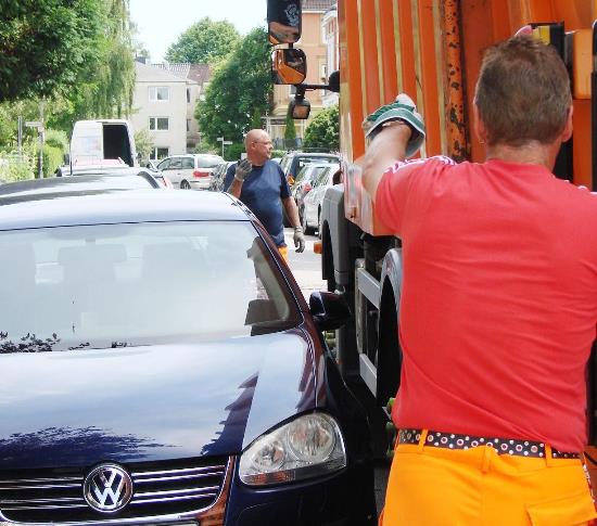 Müllwagen der Entsorgungsbetriebe hat immer wieder Probleme durch das beidseitige Parken durchzukommen