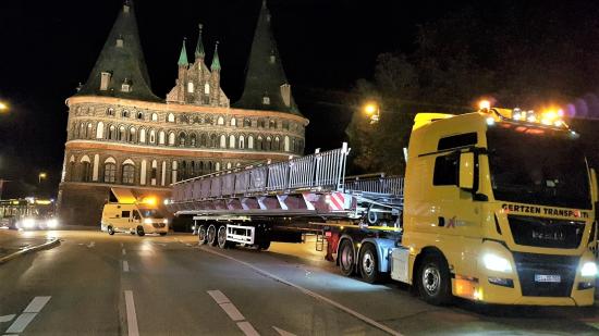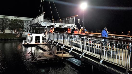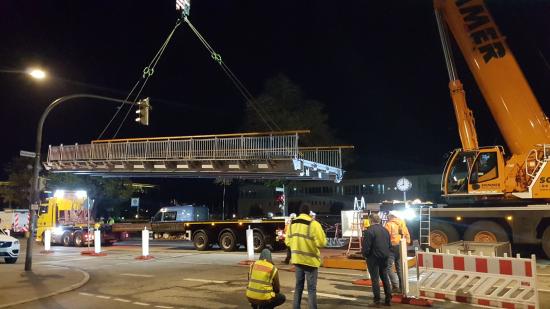 Fotos: TBF/Holger Kröger · Nächtliche Straßensperrung–MuK-Brücke voraussichtlich ab 24. Oktober 2020 wieder nutzbar. Nach rund drei Monaten kehrt die Holstenhafenbrücke nach Lübeck zurück: In der Nacht vom 5. Auf den 6. Oktober 2020 werden die Brückenteile wieder platziert. Im Zuge der Baumaßnahme wird die Straße „An der Untertrave“ am Montag, 5. Oktober, ab 21 Uhr bis Dienstag, 6. Oktober, voraussichtlich 5 Uhr morgens, für den Einhub zweier Brückenteile im Bereich Beckergrube voll gesperrt. (weitere Fotos Seite 2 >>>>>)Der Verkehr aus Richtung Hubbrücke kommend wird über die Willy-Brand-Allee umgeleitet. Eine Zufahrt zur Beckergrube ist nur vom Holstentorplatz kommend über die Straße An der Untertrave möglich. Der Verkehr der Beckergrube wird über Fünfhausen/Schüsselbuden und Holstenstraße abgleitet. Im Anschluss werden die anderen beiden Brückenteile von der anderen Uferseite aus („MuK-Seite“) eingehoben.