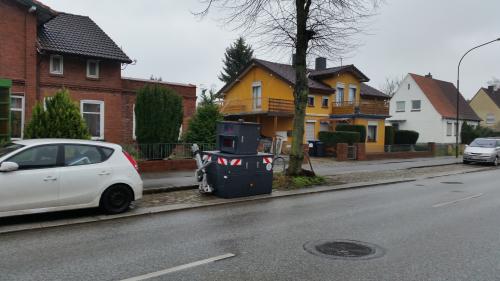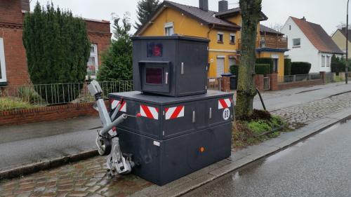 Fotos: TBF/Holger Kasnitz · Achtung, liebe Leser, aufgepaßt: Neuer Blitzer in Lübeck, erst stand er in der Krempelsdorfer Allee, Höhe Hausnummer 58, gegenüber der Souchaystraße. heute stand ein wohl neuer Blitzanhänger in Lübeck, Stadtauswärts in Richtung Stockelsdorf. Farbe: Dunkelgrau.Seit längerem kennen wir den grünen Blitzanhänger. Einer von ihnen wurde kürzlich in der Travemünder Allee von einem Jugendlichen mit Farbe beschmiert. Der Mann wurde von der Polizei mit Schwamm und Reinigungsmittel in der Hand aufgegriffen, er war auf dem Weg zu dem Anhänger und wollte ihn reinigen, weil er seinen Fehler, den das Blitzerfenster zu beschmieren,  eingesehen hatte und es wieder sauber machen wollte. (siehe unten stehenden Link)>>>