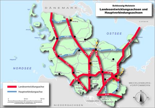 Mit der A 20 und A 21 kommen weitere Landesentwicklungsachsen hinzu. Hauptverbindungsachsen wie die B 202, B 76, A 210 und B 203 verbinden die Entwicklungsachsen miteinander und verdeutlichen die Erreichbarkeit von Schwerpunkten auf diesen Achsen an die Hauptverkehrsströme von und nach Skandinavien und Osteuropa.