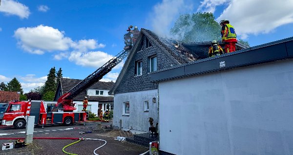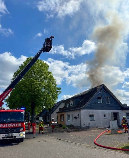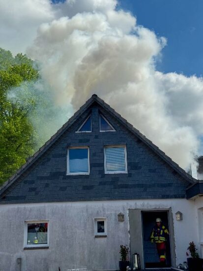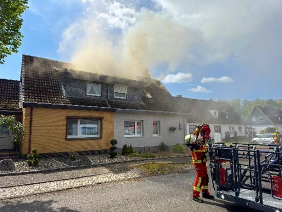Neumünster. (tny). Am Samstagnachmittag wurden die Einsatzkräfte der Feuerwehr sowie dem Rettungsdienst zu einem dramatischen Großbrand im Stadtteil Wittorf gerufen. Gegen 15:10 Uhr ging die Alarmmeldung für die Doppelhaushälfte im Tannenweg ein. Bereits bei Ankunft der Berufsfeuerwehr Neumünster war eine massive Rauchentwicklung aus dem Dachstuhl sichtbar. Der Hausbesitzer versuchte zunächst mit einem Gartenschlauch, die Flammen einzudämmen – jedoch vergeblich.