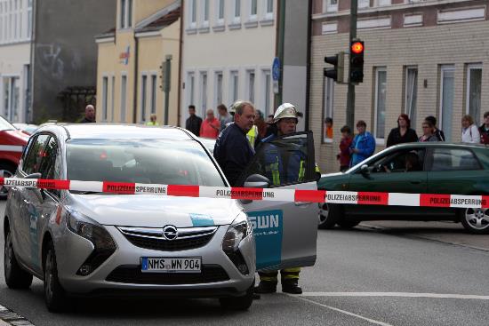 Fotos und Text: Maria Heidecke (mhe) – Gasgeruch löst Großeinsatz aus – Kieler Straße gesperrt. Neumünster (mhe)- Am Dienstagnachmittag gegen 16:15 Uhr wurde die Polizei und der Rettungsdienst wegen dem Verdacht der Körperverletzung zu einer Wohnung in der Kieler Straße 71 gerufen. Bereits im Treppenhaus bemerkten die Polizei und die Rettungskräfte einen starken Gasgeruch woraufhin die Berufsfeuerwehr Neumünster mit dem Gefahrgutzug und die Stadtwerke Neumünsteralarmiert wurde. Sie sperrte die Kieler Straße zwischen der Anschar- und der Bismarkstraße ab und evakuierte die ca. zehn Bewohner des Hauses. Der Besucher der Bewohnerin öffnete erst nach dem Klopfen der Rettungskräfte die Tür und die Feuerwehr konnte einen Grill auf dem Balkon sicherstellen. Die Einsatzkräfte vermuten den Anzünder und die Holzkohle als Ursache des starken Geruches, der dem Gasgeruch sehr ähnelt. Trotzdem maß zuerst die Feuerwehr unter schwerem Atemschutz und dann die Stadtwerke Neumünster die Wohnung aus und testeten mit speziellen Messgeräten den Gasgehalt der Luft. Da dieser im Normbereich lag bestand keine Gefahr einer Gasexplosion, auch wenn das betroffene Haus an der Gasversorgung angeschlossen ist, welche zwischenzeitlich abgeschaltet war.Die Kameraden der Feuerwehr setzten ihren Druckbelüfter ein um das Haus zu belüften und den Gasgeruch durch die offenen Fenster abziehen zu lassen. Die alkoholisierte Bewohnerin der Wohnung im zweiten Obergeschoss wurde vorsorglich ins Friedrich-Ebert Krankenhaus gebracht. Ihr Besucher, ebenfalls unter Alkoholeinfluss, wurde von der Polizei mit zur Wache genommen,dort wird der Vorwurf der Körperverletzung weiter ermittelt. Die Kieler Straße war ca. eine Stunde komplett gesperrt, insgesamt waren ca. 30 Einsatzkräfte von Feuerwehr, Polizei, Rettungsdienst und den Stadtwerken Neumünster vor Ort.